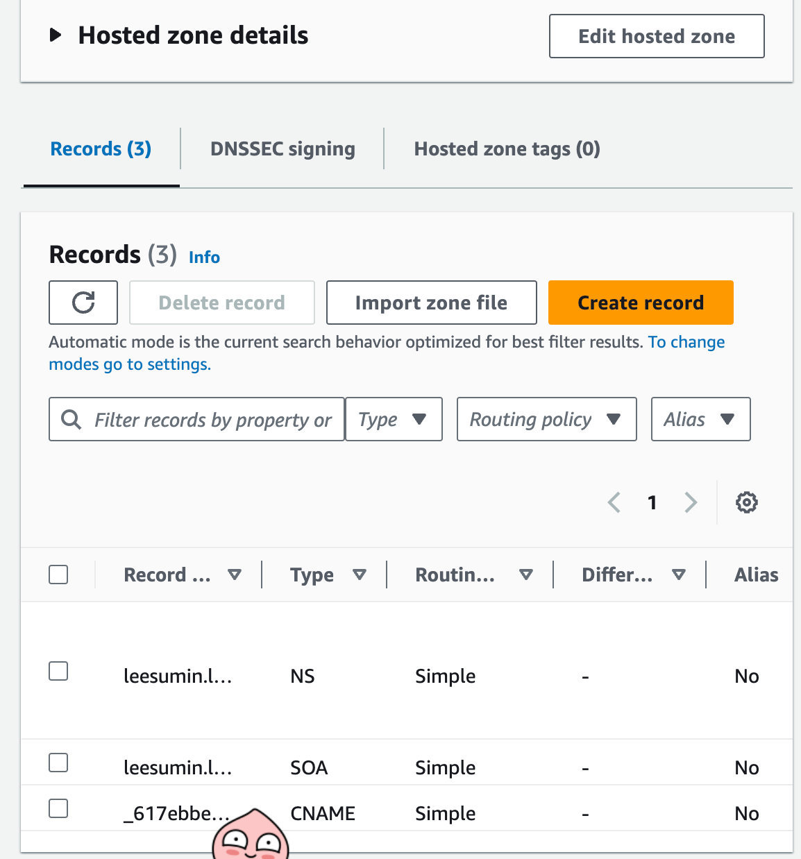== Route 53으로 가서 hosted zone detail 로 이동 후 직접 record를 입력을 해주어야 한다.