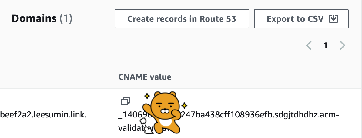 aws certificate manager > certificates 에서 인증서 고른후 아래 사진과 같이 Create records in Route 53을 누르면 cname이 자동으로 등록되지만 외부 구매 도메인일시 cname 을 직접 입력해줘야 한다.