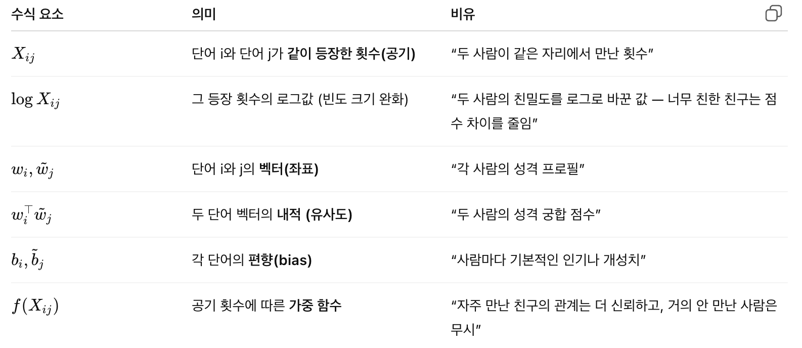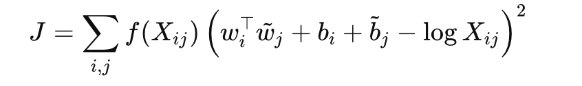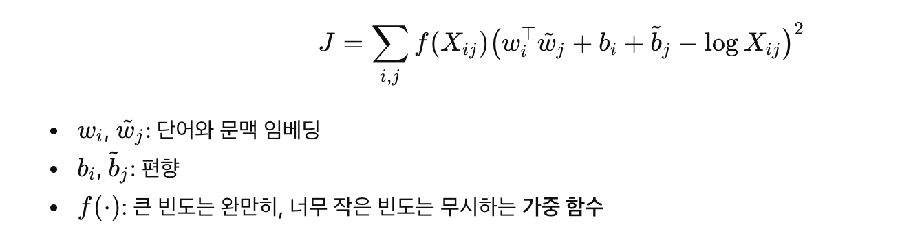 💬 “단어 쌍들의 친밀도(=log X_ij)를, 두 벡터의 거리(=내적 + 편향)로 잘 설명하도록