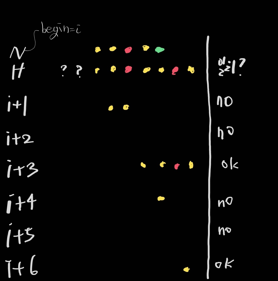 for (int begin = 0; begin + N.length() <= H.length(); ++begin) {